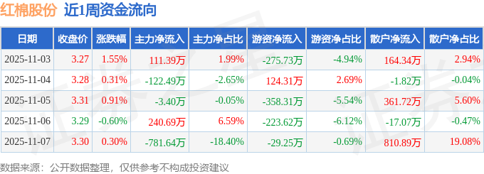 资金流向数据方面,本周红棉股份主力资金合计净流出555.45万元,游资资金合计净流出762.61万元,散户资金合计净流入1318.07万元。本周资金流向一览见下表: