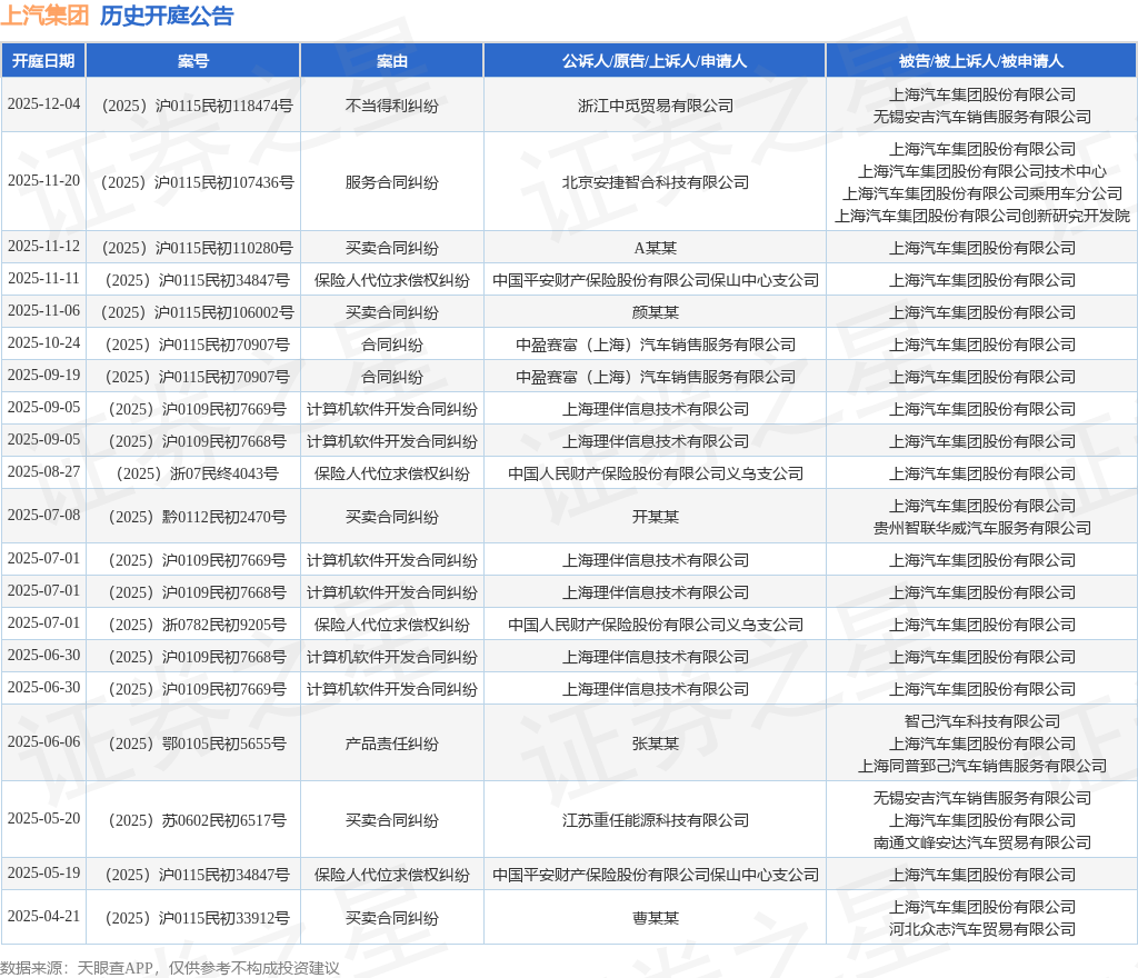 案号:(2025)沪0115民初34847号根据统计,近一年内以上海汽车集团股份有限公司为当事人的历史开庭公告有33则,其中案由为“买卖合同纠纷”的公告以12则居首,其次为“计算机软件开发合同纠纷”有6则,“保险人代位求偿权纠纷”有4则。历史开庭公告(前20条)如下: