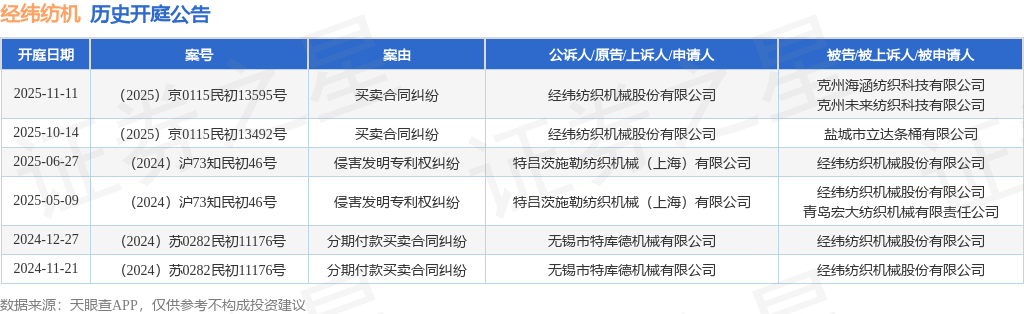 案号:(2025)京0115民初13595号根据统计,近一年内以经纬纺织机械股份有限公司为当事人的历史开庭公告有6则,其中案由为“买卖合同纠纷”的公告以2则居首,其次为“侵害发明专利权纠纷”有2则,“分期付款买卖合同纠纷”有2则。历史开庭公告如下: