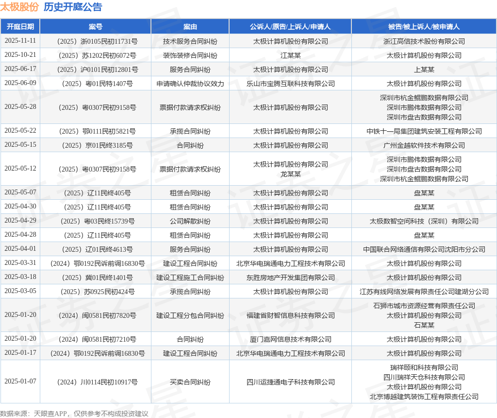 案号:(2025)浙0105民初11731号根据统计,近一年内以太极计算机股份有限公司为当事人的历史开庭公告有32则,其中案由为“合同纠纷”的公告以4则居首,其次为“服务合同纠纷”有4则,“建设工程分包合同纠纷”有3则。历史开庭公告(前20条)如下: