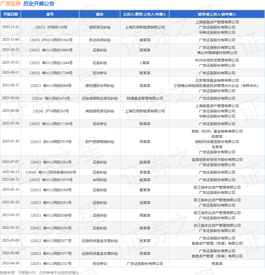 案号:(2025)沪民终538号根据统计,近一年内以广发证券股份有限公司为当事人的历史开庭公告有42则,其中案由为“证券纠纷”的公告以14则居首,其次为“证券投资基金交易纠纷”有7则,“证券虚假陈述责任纠纷”有5则。历史开庭公告(前20条)如下: