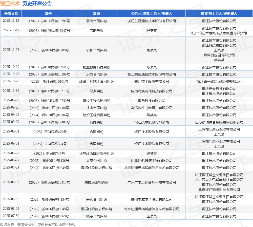 案号:(2025)浙0106民初13947号根据统计,近一年内以银江技术股份有限公司为当事人的历史开庭公告有93则,其中案由为“票据追索权纠纷”的公告以12则居首,其次为“合同纠纷”有12则,“劳动争议”有11则。历史开庭公告(前20条)如下: