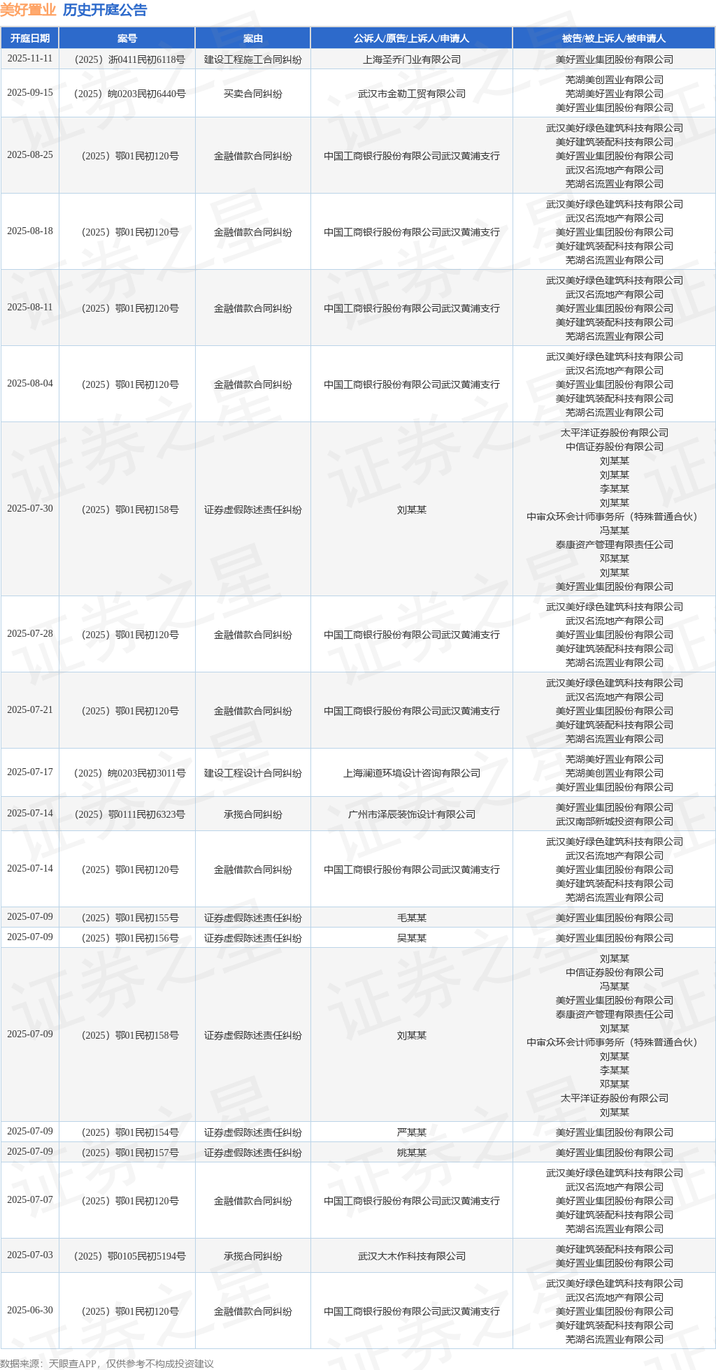 案号:(2025)浙0411民初6118号根据统计,近一年内以美好置业集团股份有限公司为当事人的历史开庭公告有77则,其中案由为“金融借款合同纠纷”的公告以18则居首,其次为“证券虚假陈述责任纠纷”有10则,“买卖合同纠纷”有9则。历史开庭公告(前20条)如下: