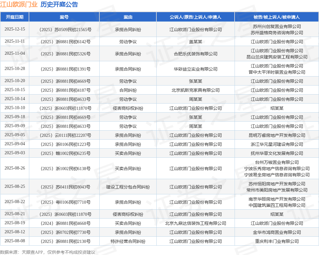 案号:(2025)浙0881民初6142号根据统计,近一年内以江山欧派门业股份有限公司为当事人的历史开庭公告有98则,其中案由为“承揽合同纠纷”的公告以32则居首,其次为“买卖合同纠纷”有19则,“劳动争议”有11则。历史开庭公告(前20条)如下: