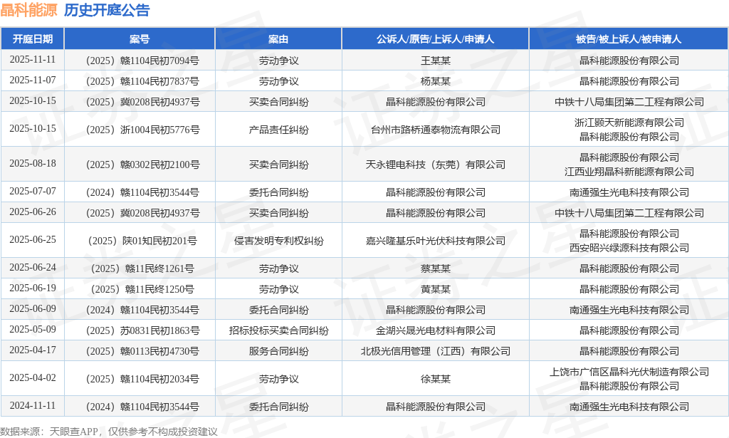 根据统计,近一年内以晶科能源股份有限公司为当事人的历史开庭公告有15则,其中案由为“劳动争议”的公告以5则居首,其次为“买卖合同纠纷”有3则,“委托合同纠纷”有3则。历史开庭公告如下: