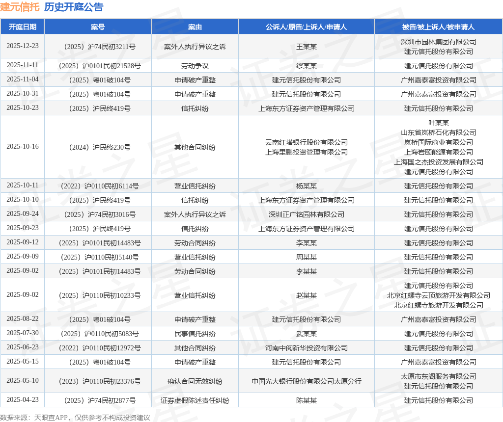 案号:(2025)沪0101民初21528号根据统计,近一年内以建元信托股份有限公司为当事人的历史开庭公告有23则,其中案由为“申请破产重整”的公告以4则居首,其次为“信托纠纷”有3则,“营业信托纠纷”有3则。历史开庭公告(前20条)如下: