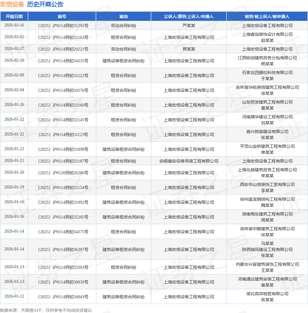 案号:(2025)浙0503民初230号根据统计,近一年内以上海宏信设备工程有限公司为当事人的历史开庭公告有2594则,其中案由为“建筑设备租赁合同纠纷”的公告以1880则居首,其次为“租赁合同纠纷”有505则,“租赁合同”有51则。历史开庭公告(前20条)如下: