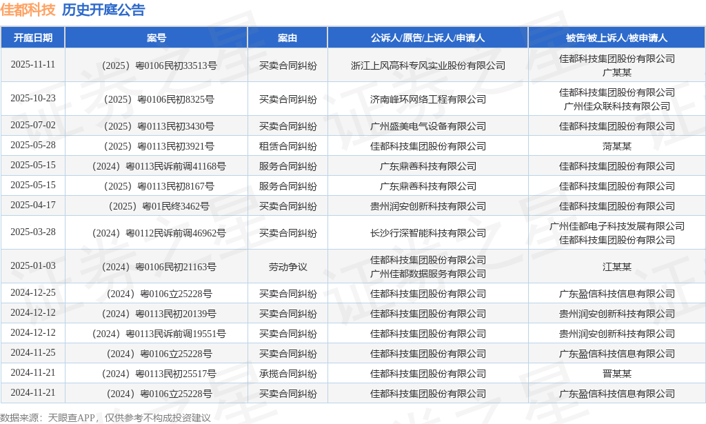 案号:(2025)粤0106民初33513号根据统计,近一年内以佳都科技集团股份有限公司为当事人的历史开庭公告有15则,其中案由为“买卖合同纠纷”的公告以10则居首,其次为“服务合同纠纷”有2则,“劳动争议”有1则。历史开庭公告如下: