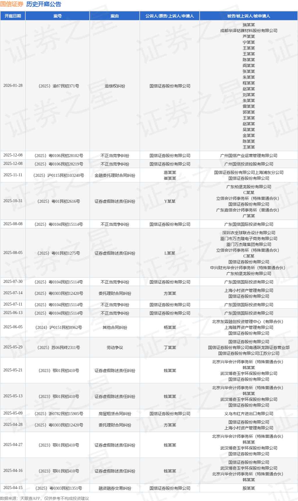 案号:(2025)沪0115民初103240号根据统计,近一年内以国信证券股份有限公司为当事人的历史开庭公告有42则,其中案由为“证券虚假陈述责任纠纷”的公告以19则居首,其次为“不正当竞争纠纷”有6则,“劳动争议”有2则。历史开庭公告(前20条)如下: