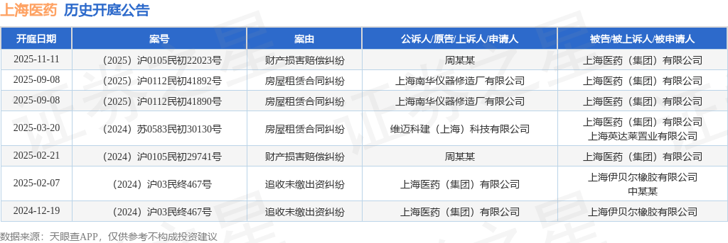 案号:(2025)沪0105民初22023号根据统计,近一年内以上海医药(集团)有限公司为当事人的历史开庭公告有7则,其中案由为“房屋租赁合同纠纷”的公告以3则居首,其次为“财产损害赔偿纠纷”有2则,“追收未缴出资纠纷”有2则。历史开庭公告如下: