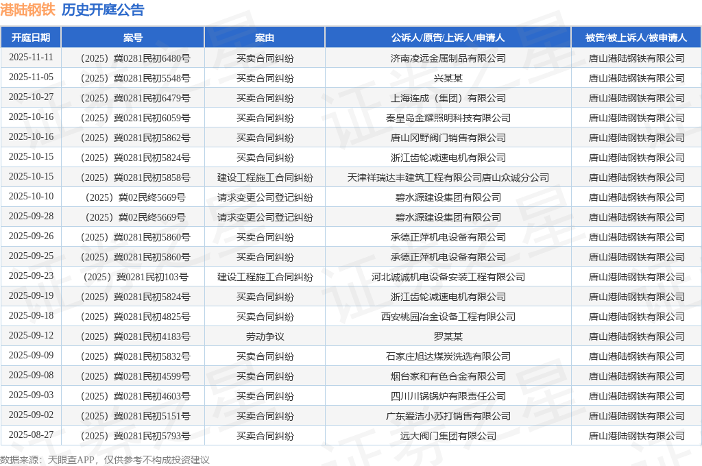 案号:(2025)冀0281民初6480号根据统计,近一年内以唐山港陆钢铁有限公司为当事人的历史开庭公告有70则,其中案由为“买卖合同纠纷”的公告以43则居首,其次为“劳务合同纠纷”有4则,“合同纠纷”有4则。历史开庭公告(前20条)如下:
