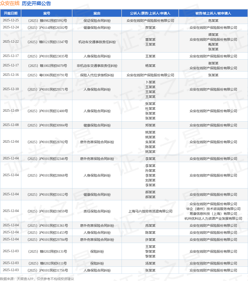 案号:(2025)沪0101民初28592号根据统计,近一年内以众安在线财产保险股份有限公司为当事人的历史开庭公告有4877则,其中案由为“保证保险合同纠纷”的公告以3181则居首,其次为“人身保险合同纠纷”有663则,“保险人代位求偿权纠纷”有288则。历史开庭公告(前20条)如下: