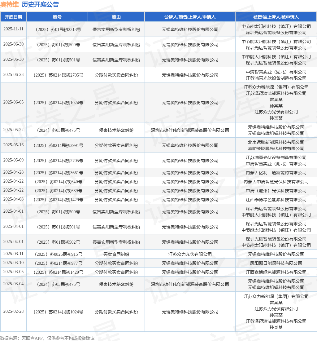 案号:(2025)苏01民初2313号根据统计,近一年内以无锡奥特维科技股份有限公司为当事人的历史开庭公告有22则,其中案由为“分期付款买卖合同纠纷”的公告以11则居首,其次为“侵害实用新型专利权纠纷”有6则,“侵害技术秘密纠纷”有3则。历史开庭公告(前20条)如下: