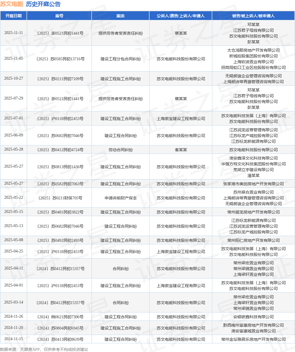 案号:(2025)浙0521民初1441号根据统计,近一年内以苏文电能科技股份有限公司为当事人的历史开庭公告有22则,其中案由为“建设工程施工合同纠纷”的公告以9则居首,其次为“建设工程合同纠纷”有5则,“合同纠纷”有2则。历史开庭公告(前20条)如下: