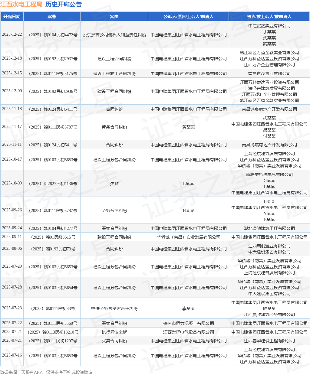 案号:(2025)赣0124民初5411号根据统计,近一年内以中国电建集团江西省水电工程局有限公司为当事人的历史开庭公告有81则,其中案由为“建设工程施工合同纠纷”的公告以13则居首,其次为“买卖合同纠纷”有12则,“建设工程分包合同纠纷”有10则。历史开庭公告(前20条)如下: