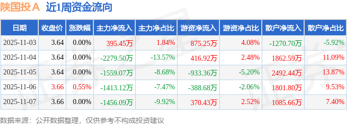 资金流向数据方面,本周陕国投A主力资金合计净流出6312.33万元,游资资金合计净流入340.55万元,散户资金合计净流入5971.78万元。本周资金流向一览见下表: