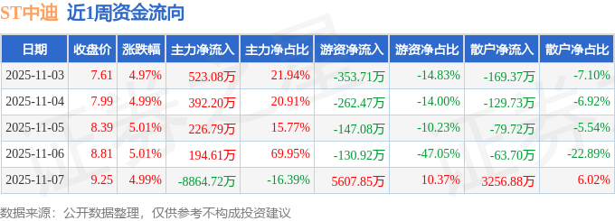 资金流向数据方面,本周ST中迪主力资金合计净流出7528.04万元,游资资金合计净流入4713.67万元,散户资金合计净流入2814.37万元。本周资金流向一览见下表: