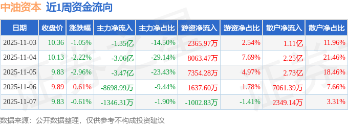 资金流向数据方面,本周中油资本主力资金合计净流出8.88亿元,游资资金合计净流入1.84亿元,散户资金合计净流入7.03亿元。本周资金流向一览见下表:
