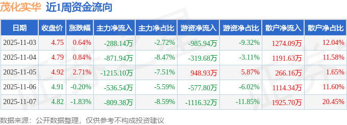 资金流向数据方面,本周茂化实华主力资金合计净流出3721.1万元,游资资金合计净流出2050.81万元,散户资金合计净流入5771.92万元。本周资金流向一览见下表: