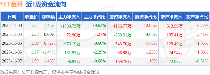 资金流向数据方面,本周*ST金科主力资金合计净流出2639.87万元,游资资金合计净流入1698.89万元,散户资金合计净流入940.98万元。本周资金流向一览见下表: