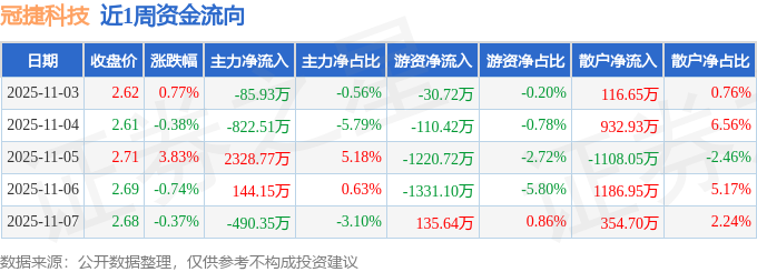 资金流向数据方面,本周冠捷科技主力资金合计净流入1074.13万元,游资资金合计净流出2557.31万元,散户资金合计净流入1483.18万元。本周资金流向一览见下表: