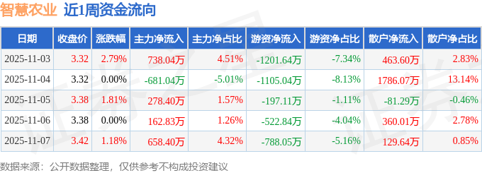 资金流向数据方面,本周智慧农业主力资金合计净流入1156.63万元,游资资金合计净流出3814.67万元,散户资金合计净流入2658.03万元。本周资金流向一览见下表: