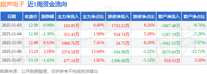 资金流向数据方面,本周超声电子主力资金合计净流入5314.89万元,游资资金合计净流入1021.96万元,散户资金合计净流出6336.85万元。本周资金流向一览见下表: