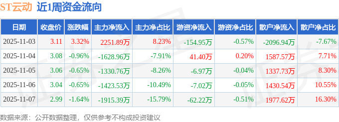 资金流向数据方面,本周ST云动主力资金合计净流出4046.75万元,游资资金合计净流出189.77万元,散户资金合计净流入4236.52万元。本周资金流向一览见下表:
