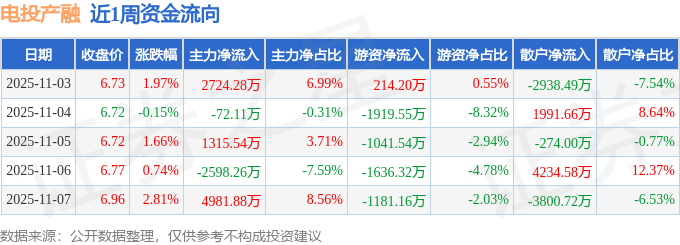 资金流向数据方面,本周电投产融主力资金合计净流入6351.34万元,游资资金合计净流出5564.37万元,散户资金合计净流出786.97万元。本周资金流向一览见下表: