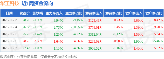 资金流向数据方面,本周华工科技主力资金合计净流出7.45亿元,游资资金合计净流入3817.98万元,散户资金合计净流入7.07亿元。本周资金流向一览见下表:
