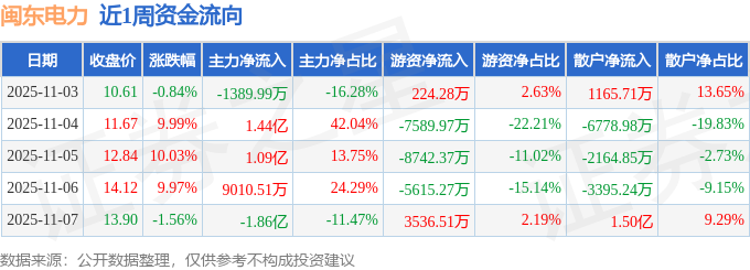 资金流向数据方面,本周闽东电力主力资金合计净流入1.43亿元,游资资金合计净流出1.82亿元,散户资金合计净流入3842.62万元。本周资金流向一览见下表: