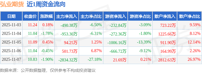 资金流向数据方面,本周弘业期货主力资金合计净流出3682.02万元,游资资金合计净流出2156.38万元,散户资金合计净流入5838.4万元。本周资金流向一览见下表:
