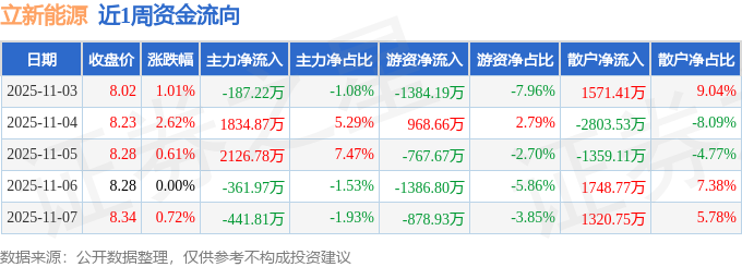 资金流向数据方面,本周立新能源主力资金合计净流入2970.66万元,游资资金合计净流出3448.94万元,散户资金合计净流入478.29万元。本周资金流向一览见下表: