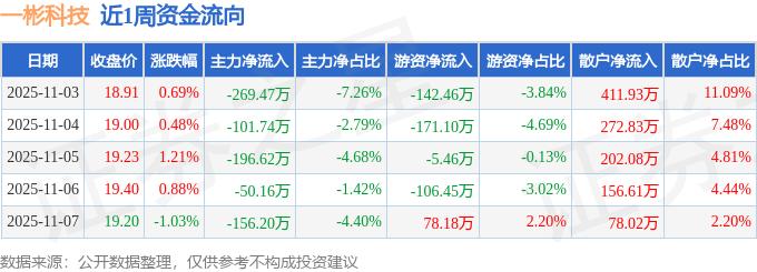 资金流向数据方面,本周一彬科技主力资金合计净流出774.2万元,游资资金合计净流出347.28万元,散户资金合计净流入1121.48万元。本周资金流向一览见下表:
