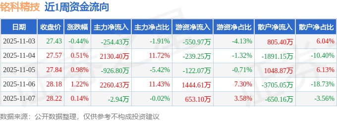 资金流向数据方面,本周铭科精技主力资金合计净流入3206.67万元,游资资金合计净流入1185.43万元,散户资金合计净流出4392.1万元。本周资金流向一览见下表:
