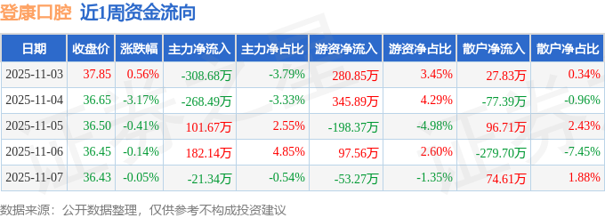 资金流向数据方面,本周登康口腔主力资金合计净流出314.71万元,游资资金合计净流入472.64万元,散户资金合计净流出157.94万元。本周资金流向一览见下表: