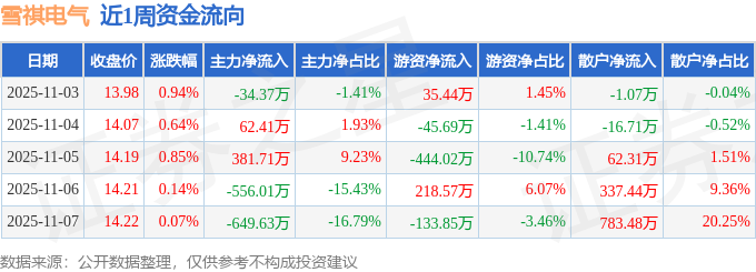 资金流向数据方面,本周雪祺电气主力资金合计净流出795.89万元,游资资金合计净流出369.56万元,散户资金合计净流入1165.44万元。本周资金流向一览见下表: