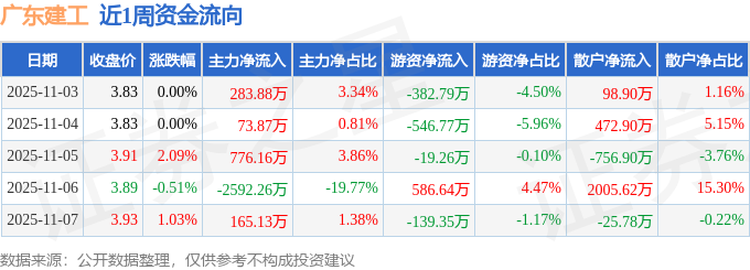 资金流向数据方面,本周广东建工主力资金合计净流出1293.21万元,游资资金合计净流出501.54万元,散户资金合计净流入1794.75万元。本周资金流向一览见下表: