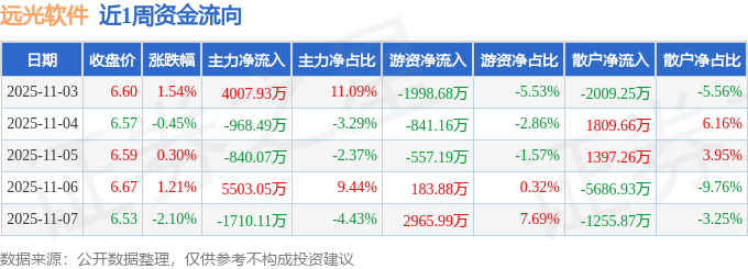 资金流向数据方面,本周远光软件主力资金合计净流入5992.31万元,游资资金合计净流出247.18万元,散户资金合计净流出5745.13万元。本周资金流向一览见下表: