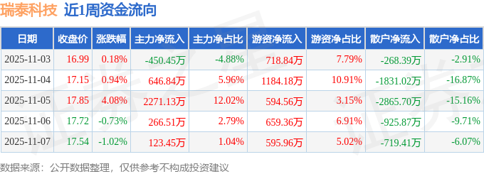 资金流向数据方面,本周瑞泰科技主力资金合计净流入2857.47万元,游资资金合计净流入3752.91万元,散户资金合计净流出6610.39万元。本周资金流向一览见下表: