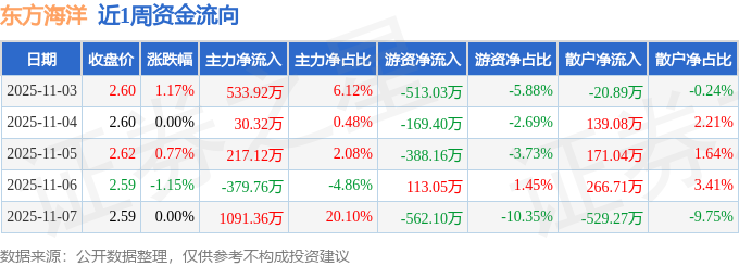 资金流向数据方面,本周东方海洋主力资金合计净流入1492.96万元,游资资金合计净流出1519.64万元,散户资金合计净流入26.68万元。本周资金流向一览见下表: