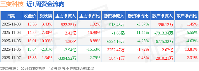 资金流向数据方面,本周三变科技主力资金合计净流入4953.01万元,游资资金合计净流出1.96亿元,散户资金合计净流入1.47亿元。本周资金流向一览见下表: