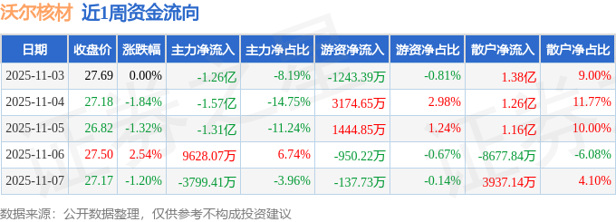 资金流向数据方面,本周沃尔核材主力资金合计净流出3.56亿元,游资资金合计净流入2288.16万元,散户资金合计净流入3.33亿元。本周资金流向一览见下表: