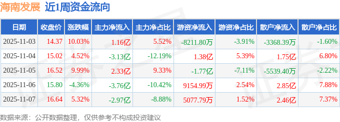 资金流向数据方面,本周海南发展主力资金合计净流出6.38亿元,游资资金合计净流入2118.53万元,散户资金合计净流入6.16亿元。本周资金流向一览见下表: