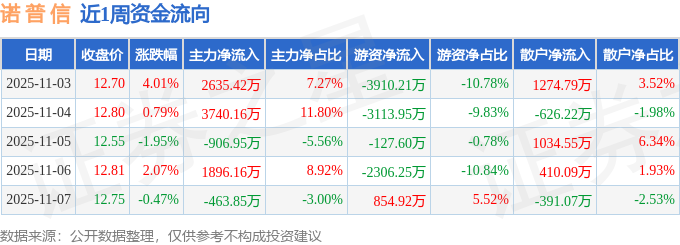 资金流向数据方面,本周诺 普 信主力资金合计净流入6900.95万元,游资资金合计净流出8603.09万元,散户资金合计净流入1702.14万元。本周资金流向一览见下表: