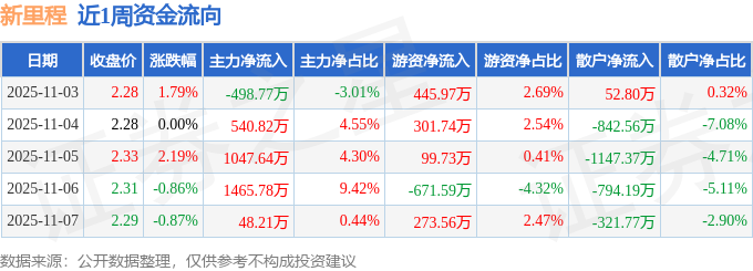 资金流向数据方面,本周新里程主力资金合计净流入2603.68万元,游资资金合计净流入449.41万元,散户资金合计净流出3053.08万元。本周资金流向一览见下表: