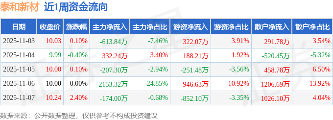 资金流向数据方面,本周泰和新材主力资金合计净流出2816.23万元,游资资金合计净流入353.33万元,散户资金合计净流入2462.89万元。本周资金流向一览见下表: