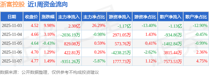 资金流向数据方面,本周浙富控股主力资金合计净流入1.28亿元,游资资金合计净流出1.06亿元,散户资金合计净流出2207.42万元。本周资金流向一览见下表:
