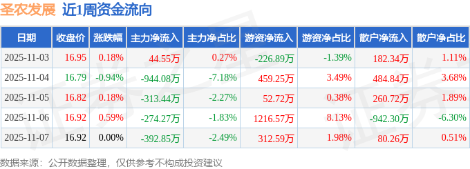 资金流向数据方面,本周圣农发展主力资金合计净流出1880.08万元,游资资金合计净流入1814.23万元,散户资金合计净流入65.86万元。本周资金流向一览见下表: