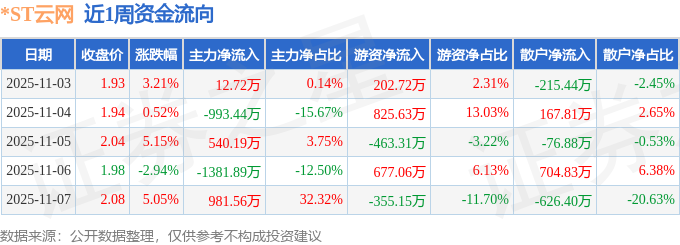 资金流向数据方面,本周*ST云网主力资金合计净流出840.85万元,游资资金合计净流入886.94万元,散户资金合计净流出46.09万元。本周资金流向一览见下表: